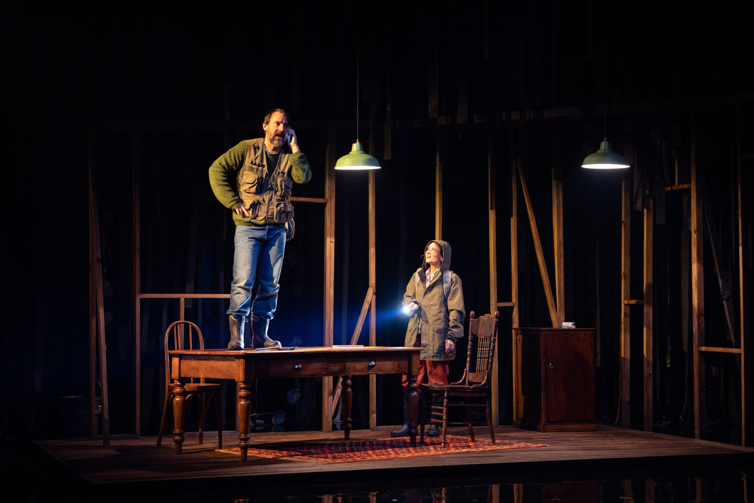 Set in current day in an English fishing cabin, Anna Tregloan’s evocative set design crafts a dark and mysterious world tucked away in a heavy forest backdrop. Wooden scaffolding on two walls of the cabin creates an open set that allows us to see through the sparsely dressed structure to the endless forest behind. A shiny floor with water splashed on it reflects glistening, watery shapes that shimmer on the ceiling, while ribbons of hanging streamers catch the light and the breeze, enriching the atmospheric, often dreamlike state. Damien Cooper’s lighting constantly balances the cold and stormy outside world with the warmly lit indoors while weaving the water versus light elements through the design.